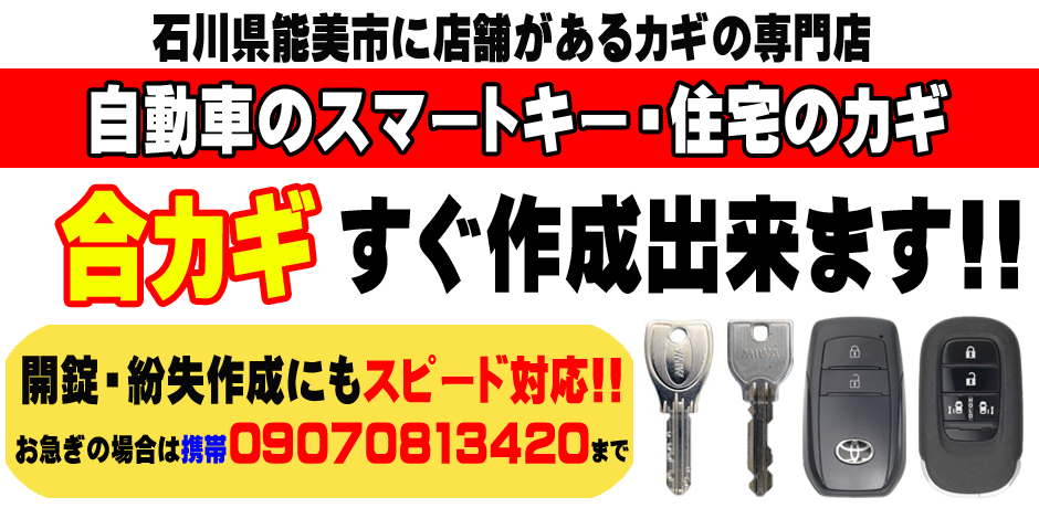 石川県能美市のカギ専門店です。近郊の小松市・川北町・加賀市・白山市・野々市市・金沢市・津幡町・かほく市など、また福井県・富山県も出張対応可能です。
